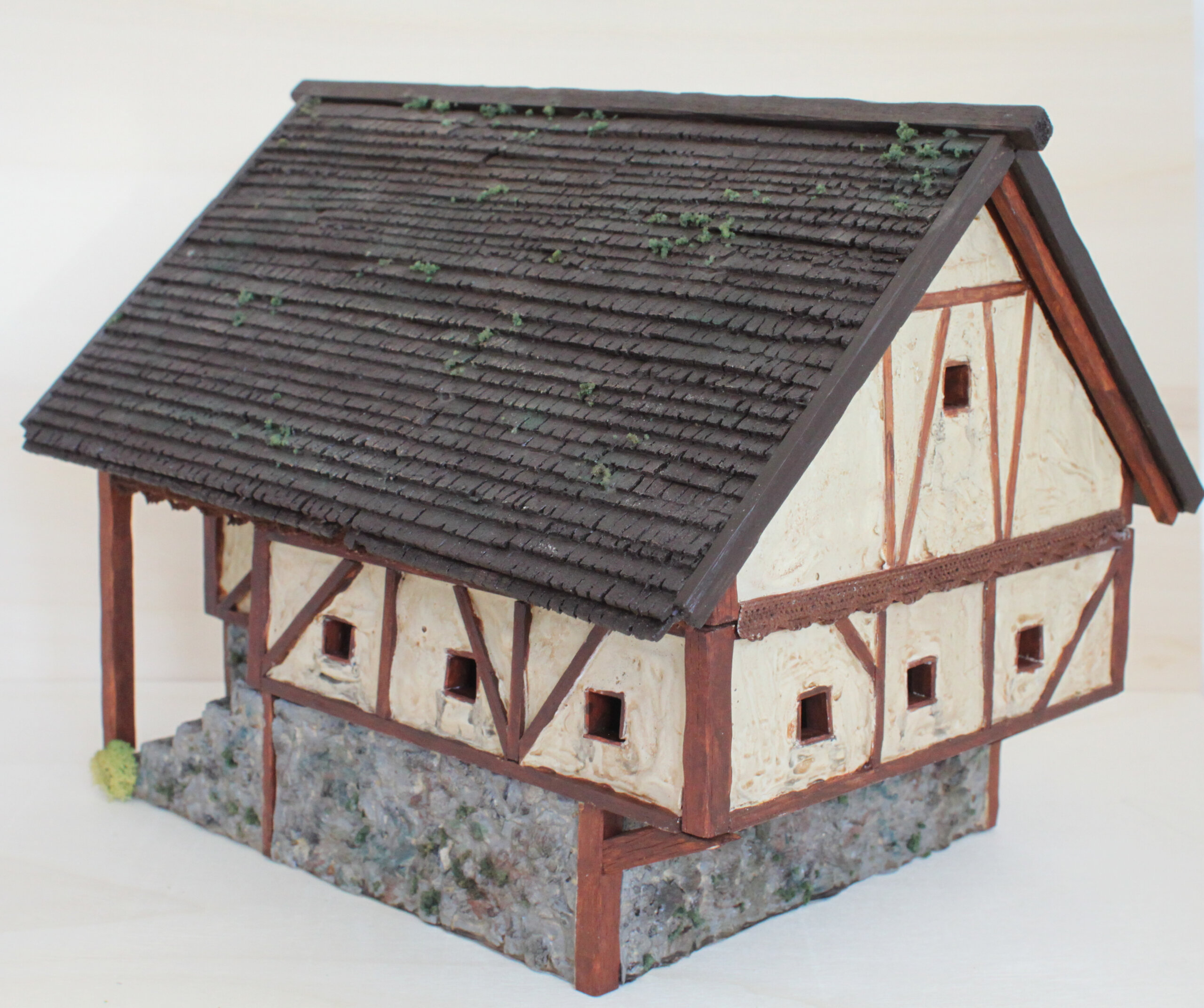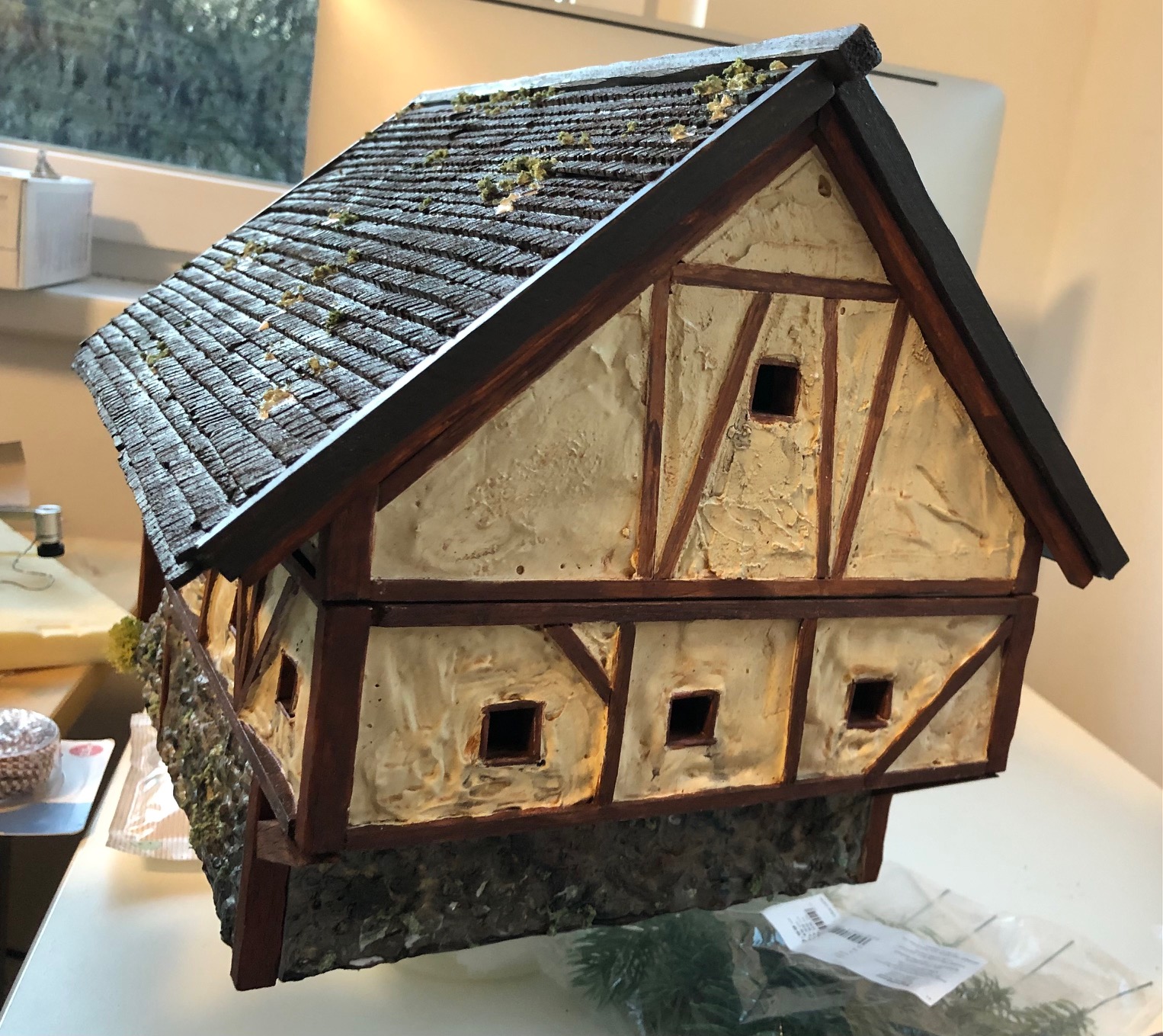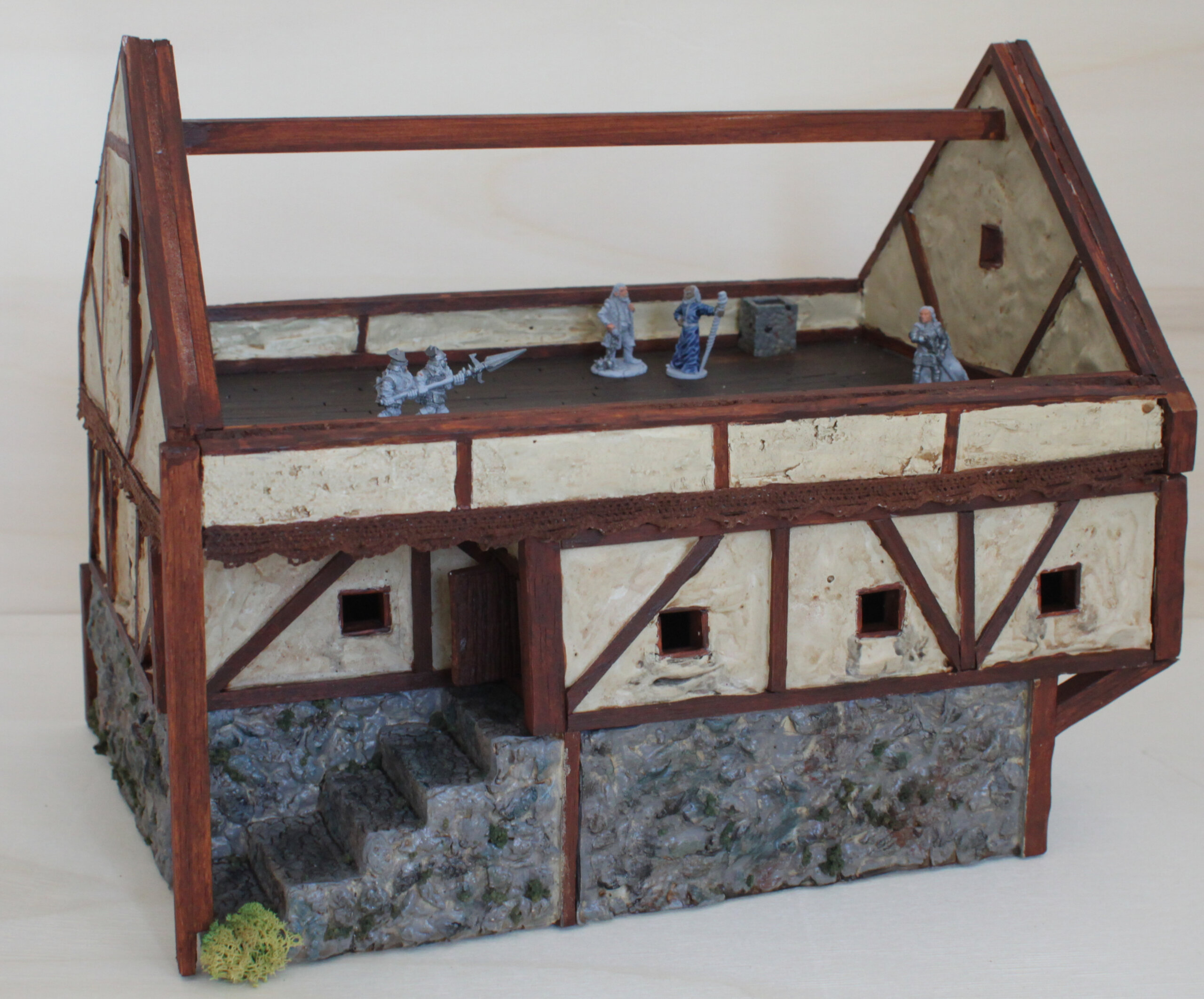 Für den Übergang vom ersten Stock zum Dachgeschoß habe ich mich entschlossen eine Zierborte im gleichen Braun wie die Balken zu bemalen und auf die unteren Balken des Dachgeschoß zu kleben. Das funktioniert überraschend gut, nur beim Aufsetzen des Dachgeschoß auf den ersten Stock gilt es aufzupassen, dass sich die Zierleiste nicht verbiegt. Bei weiteren Projekten würde ich jedoch einfach die Bodenplatte ein paar Millimeter weiter oben einkleben (so dass die Mauern etwas nach untern überstehen), so dass die beim Bau der Stockwerke aufgetretenen Probleme des Verziehens der Bodenplatte keine Auswirkung auf den Sitz der Stockwerke haben.