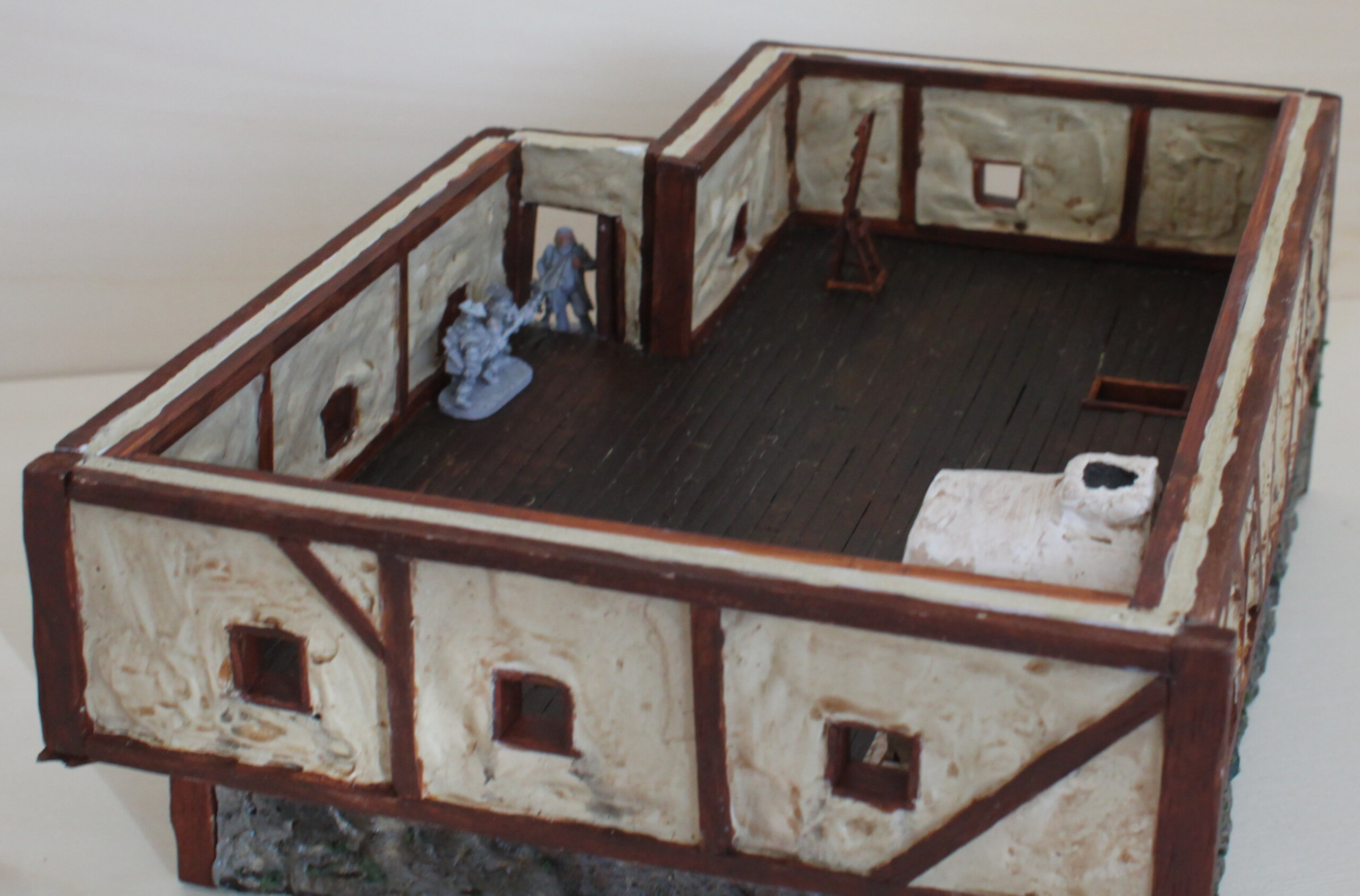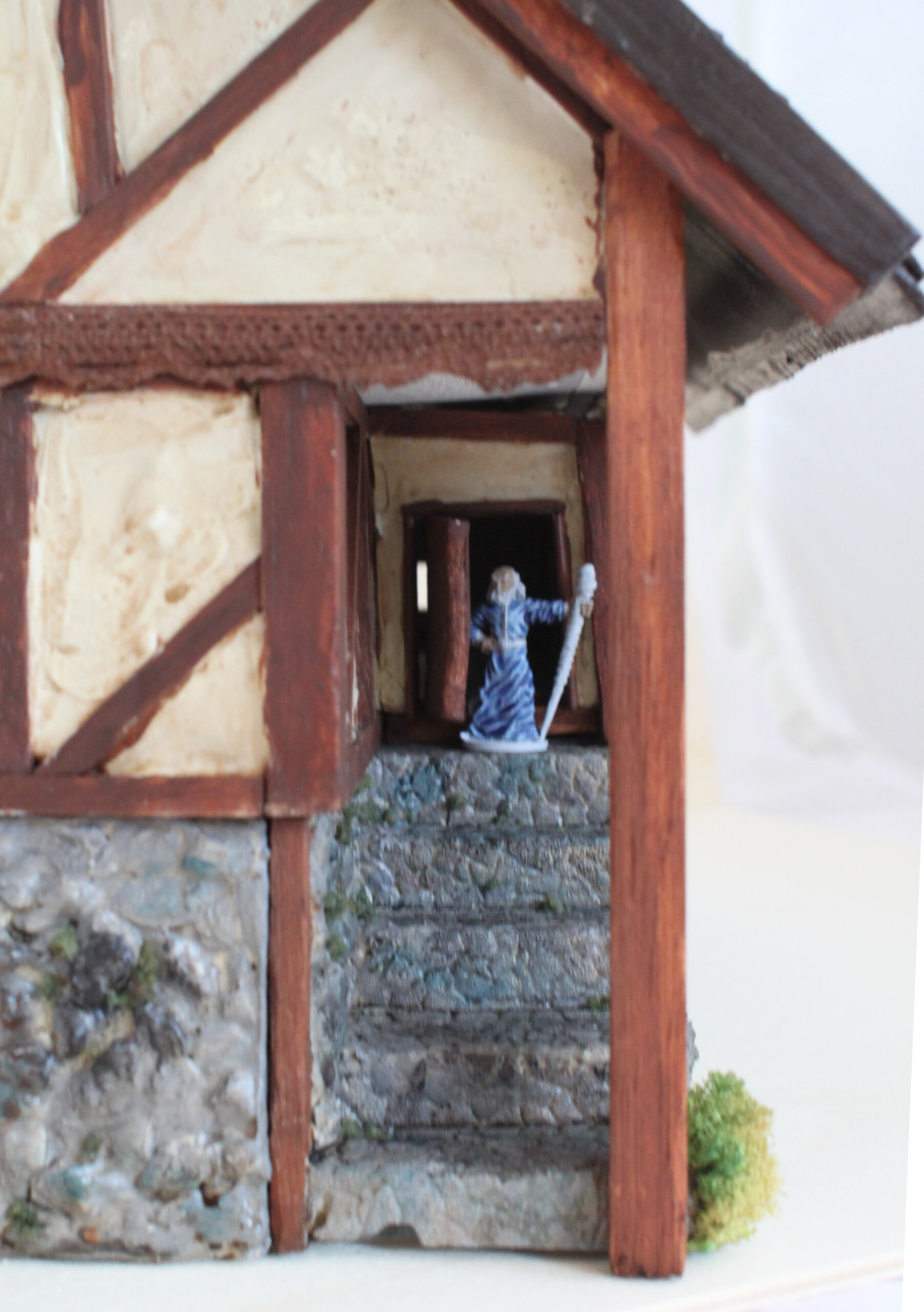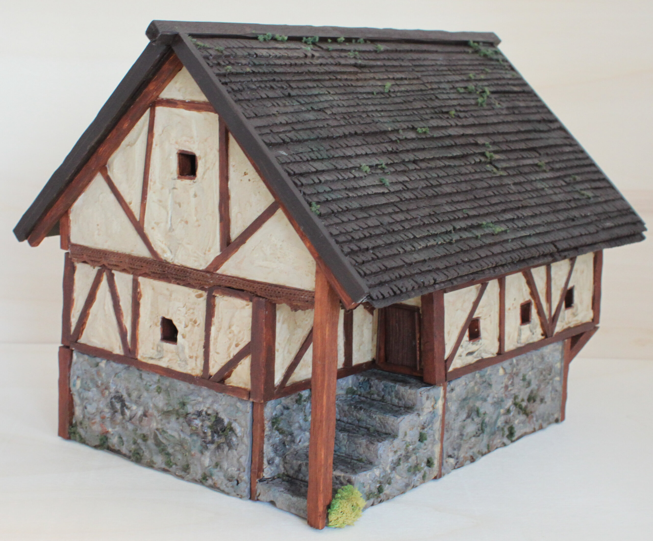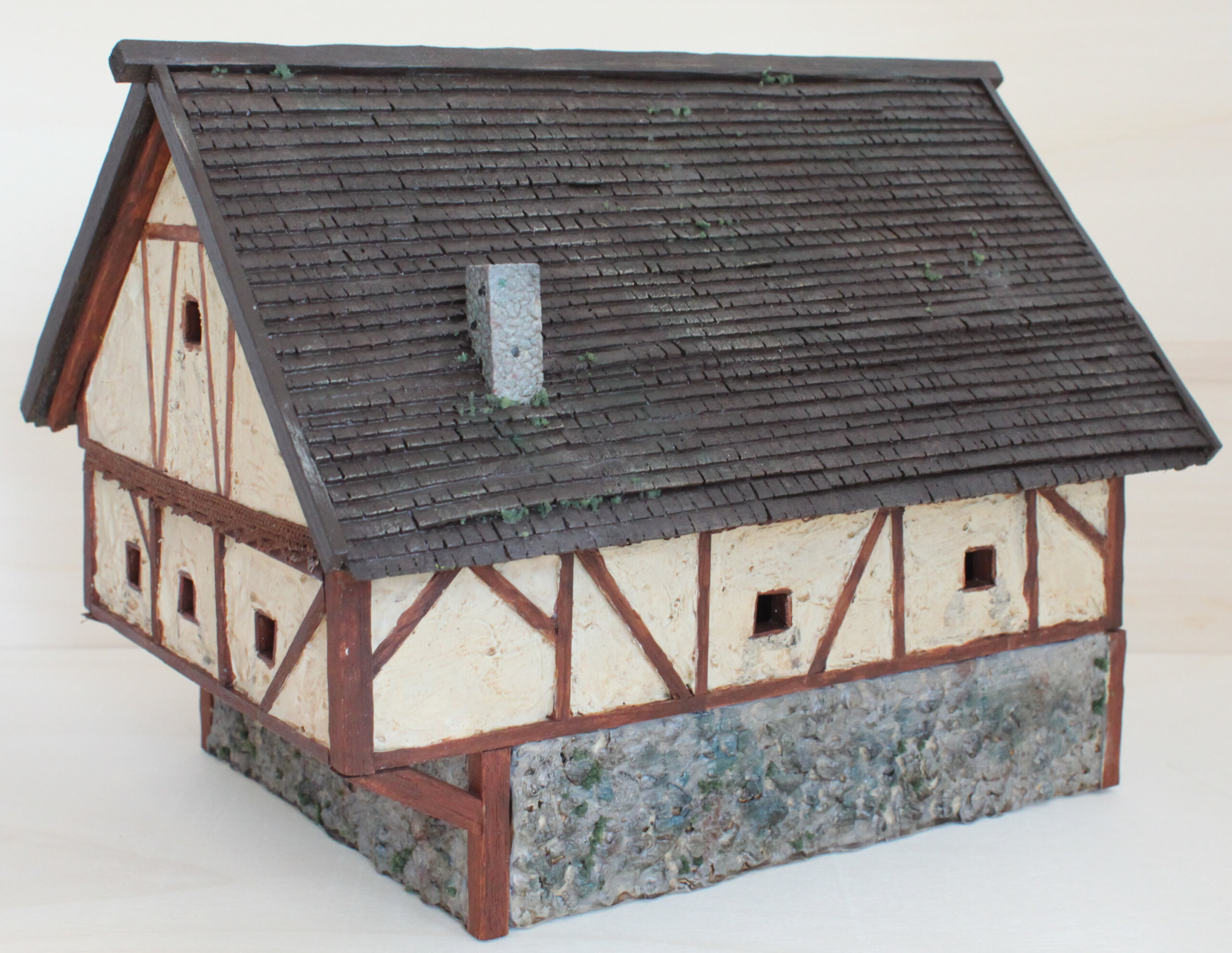 Für den Übergang vom ersten Stock zum Dachgeschoß habe ich mich entschlossen eine Zierborte im gleichen Braun wie die Balken zu bemalen und auf die unteren Balken des Dachgeschoß zu kleben. Das funktioniert überraschend gut, nur beim Aufsetzen des Dachgeschoß auf den ersten Stock gilt es aufzupassen, dass sich die Zierleiste nicht verbiegt. Bei weiteren Projekten würde ich jedoch einfach die Bodenplatte ein paar Millimeter weiter oben einkleben (so dass die Mauern etwas nach untern überstehen), so dass die beim Bau der Stockwerke aufgetretenen Probleme des Verziehens der Bodenplatte keine Auswirkung auf den Sitz der Stockwerke haben.