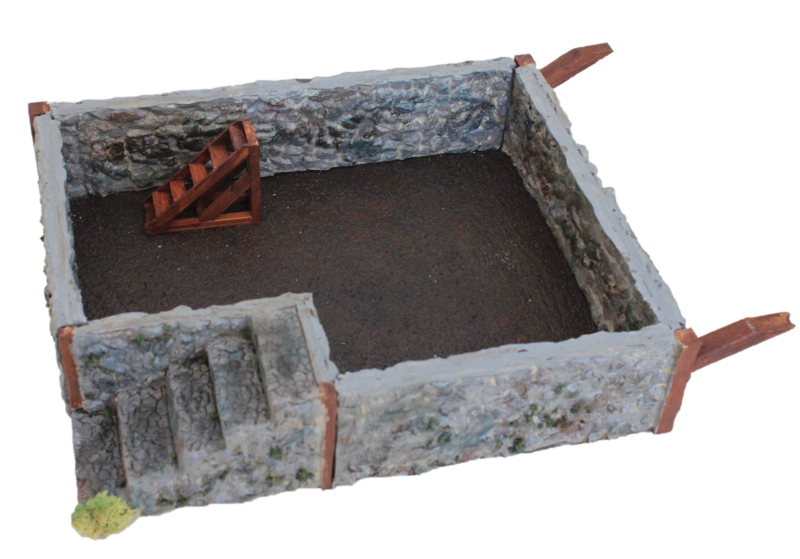 Mit einem Bleistift wurde der Umkreis des Teelichts eingezeichnet und der Quader ausgehöhlt. Nach dem das Teelicht eingepasst war, wurde die Oberseite Schwarz grundiert. Das Teelicht eingeklebt und mit Heißkleber die Flamme modelliert und anschließend bemalt. Die Oberseite des Ofens wurde ebenfalls aus einem XPS Quader ausgehöhlt, die Innenseite Schwarz grundiert und auf die Basis aufgeklebt. Im Anschluss wurde das Modell von außen vergipst.